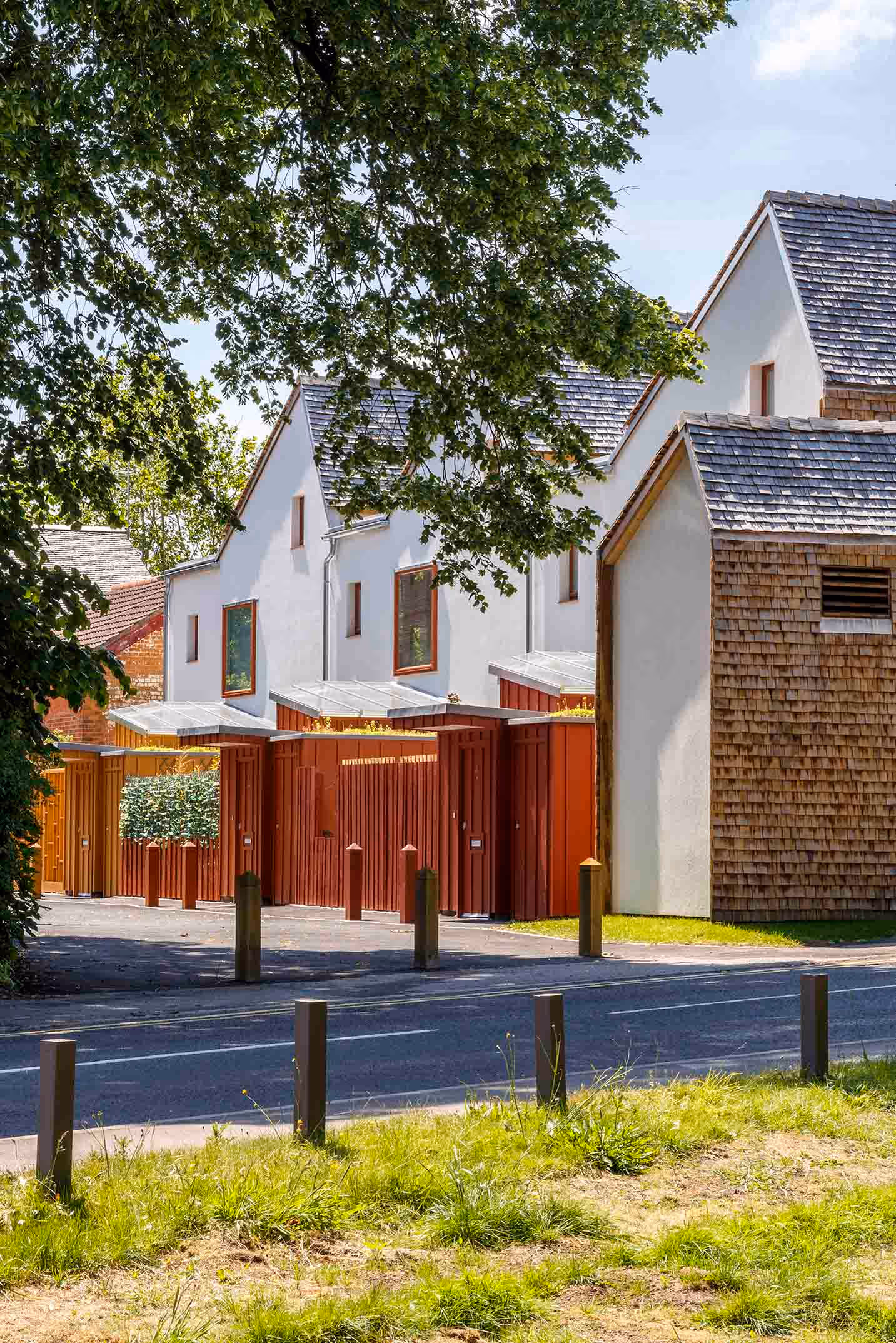 A tall, skinny building at the entrance to the terrace houses a communal recycling and refuse storage area; it also provides an attic home for bats, and eaves for house martins to nest in.