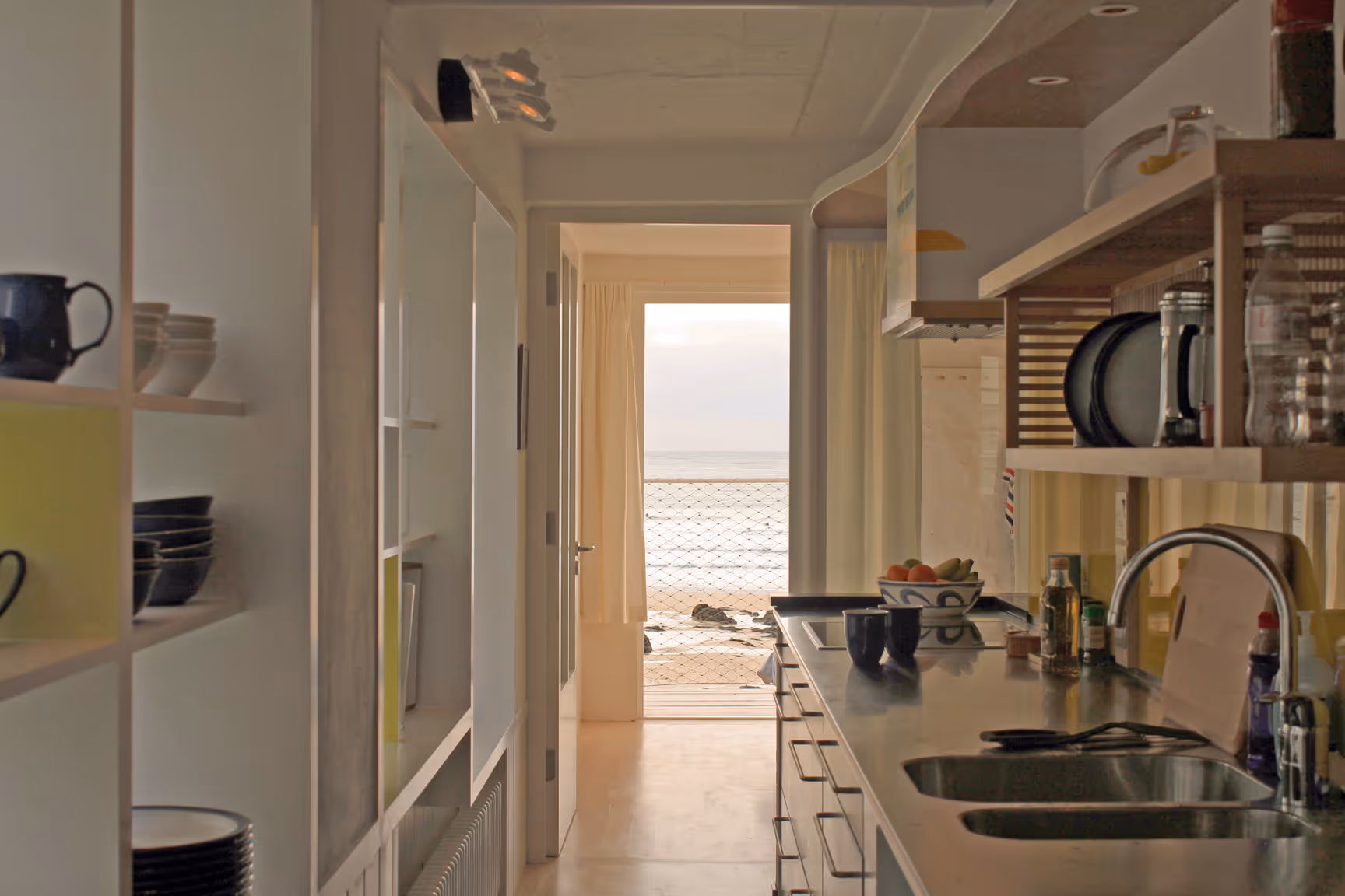 Upper Saltings is on the top floor, a former sail loft where nets, ropes and sails would have been stored and repaired. Bedrooms and bathrooms are made as small as possible in order to create a very large living room at the beach end of the apartment, under a tent-like roof. A day bed fills the projecting bay window and hangs over the beach. One of the bedrooms, the bunk-room, inspired by ship’s cabins, accommodates six full size bunks in the space of a former single bedroom.