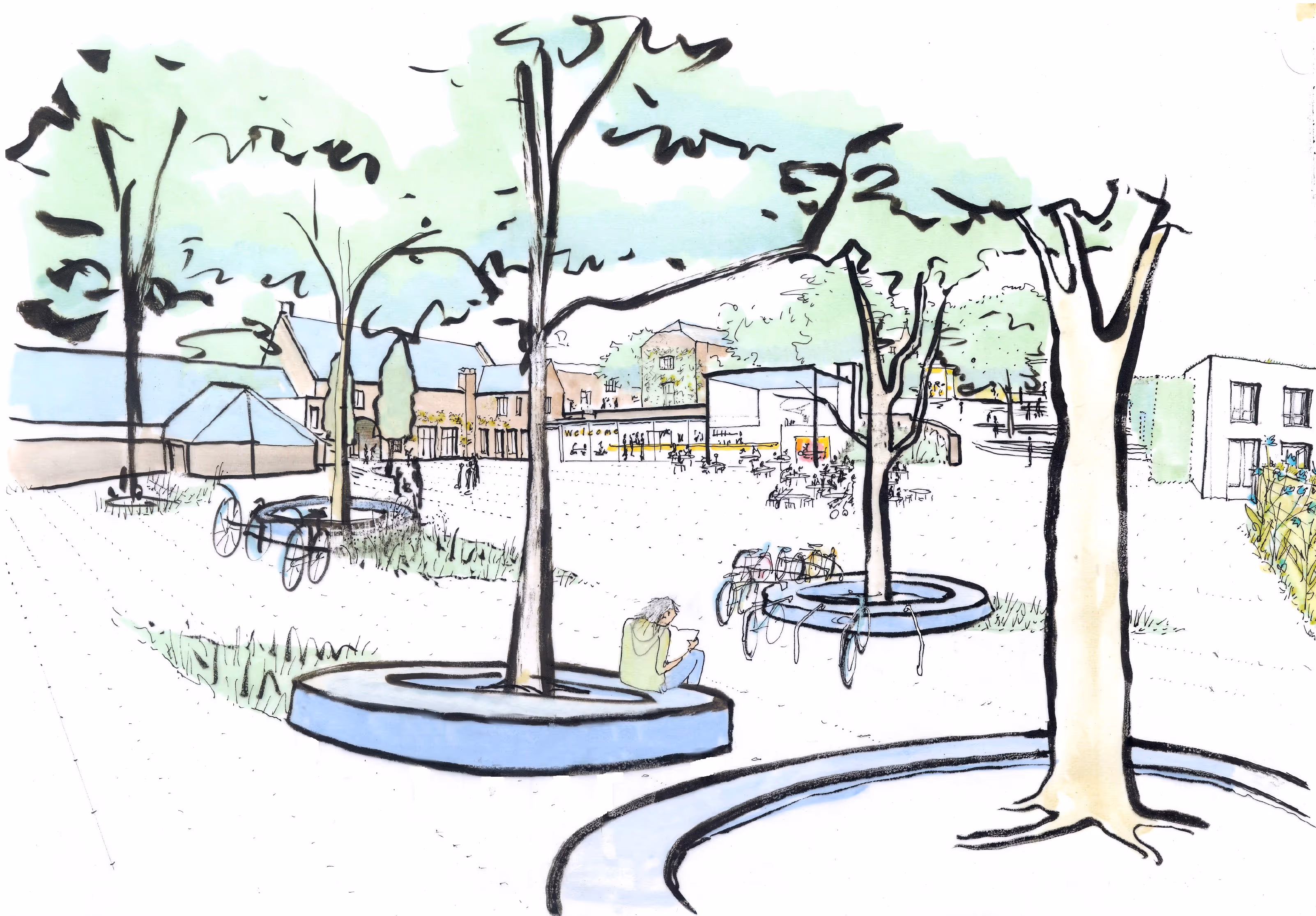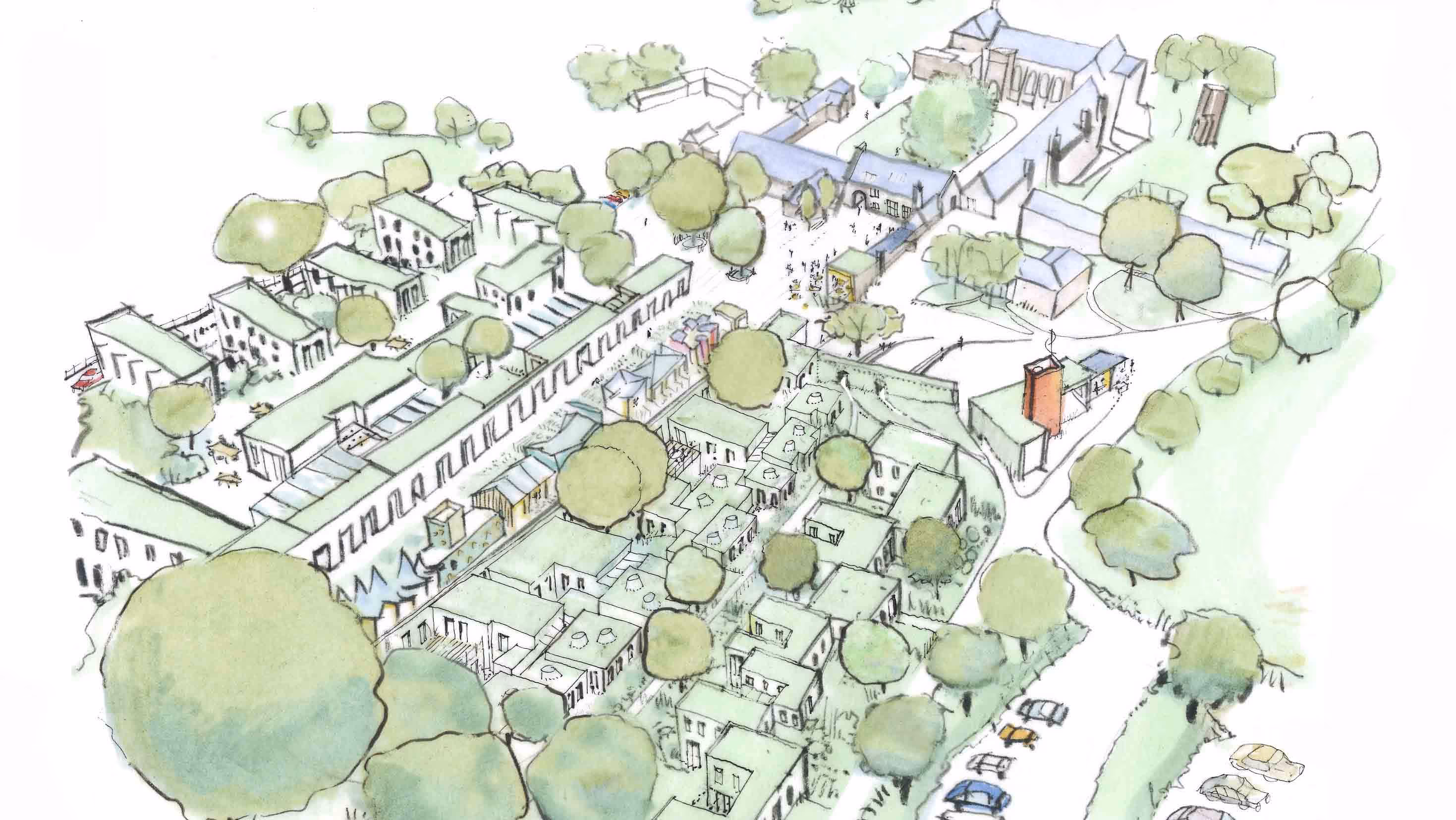 Between the new campus and the old courtyard we located a Welcome Centre, the first point-of-call for visitors, with a new square running down the hillside below it. New car parks were situated up the hill, and traffic diverted to the edge of the campus.