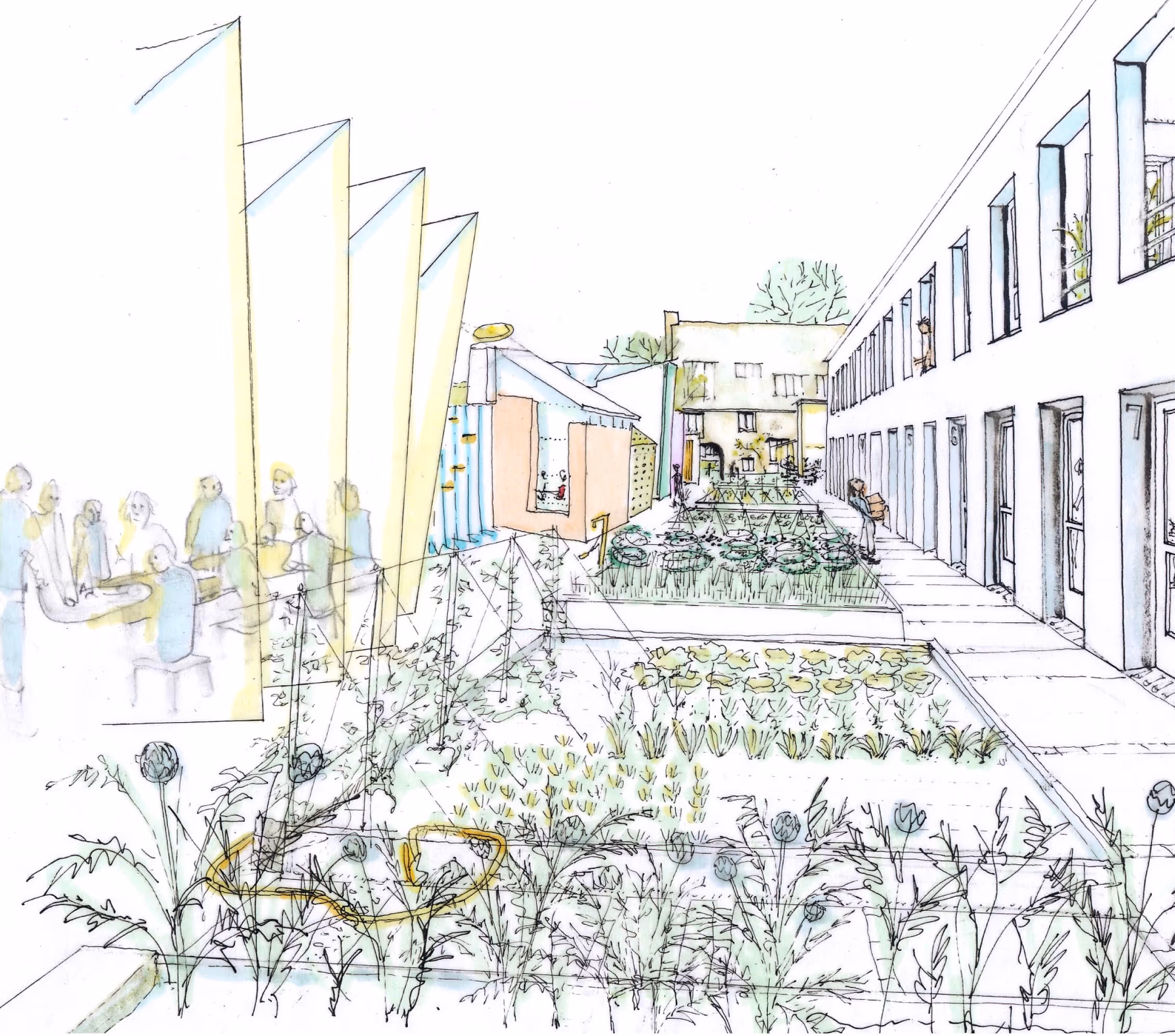 Dartington’s intention was to open an Arts Park, alternatively called an Ideas Laboratory, a rural counterpart to the science parks located on college and university campuses elsewhere. Our carefully phased masterplan made a number of decisive moves. A new enfilade stretched across the hillside from Dartington’s main archway entrance, occupying the site of a car park. It comprised two massive rammed earth walls behind which sheltered new and existing buildings housing co-working studios. Between the walls were gardens and a row of meeting pavilions which we called sitooteries, to be constructed incrementally as the fruits of an annual open architectural competition.