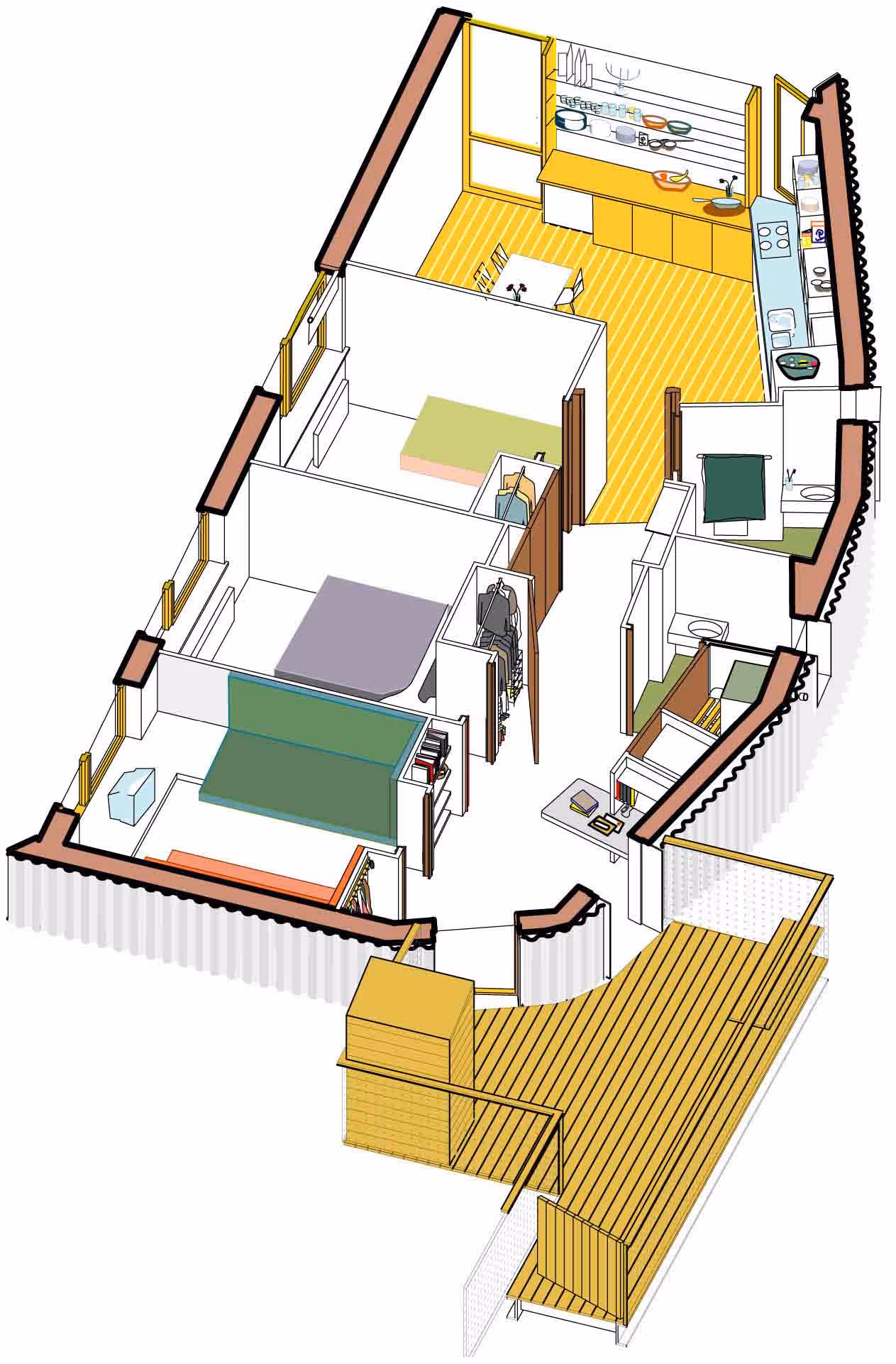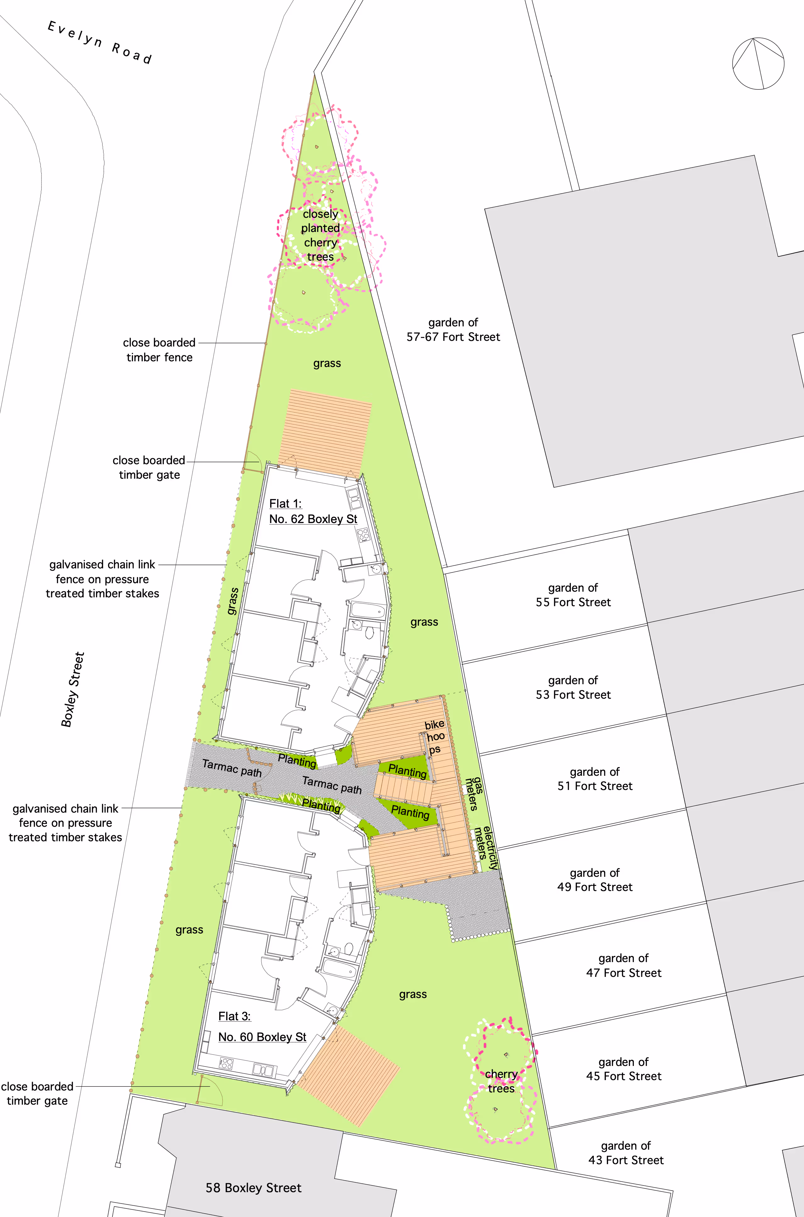 The ground-floor flats open onto their own gardens and patio decks, while the first-floor flats are connected by a prefabricated steel and timber structure which incorporates stair access and private outdoor deck-space for the upper flats, where occupants can encounter each other in space that is simultaneously private and shared.