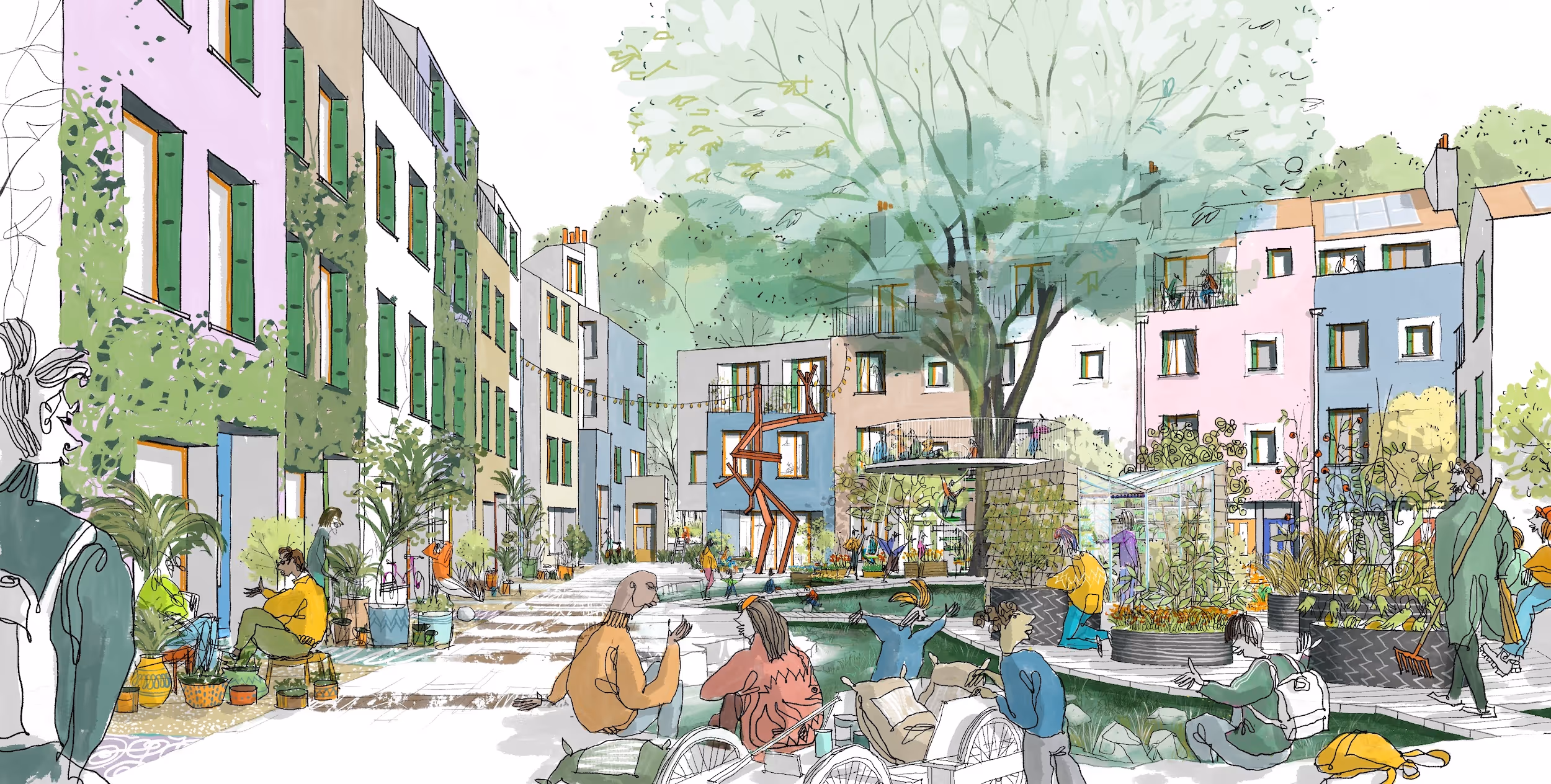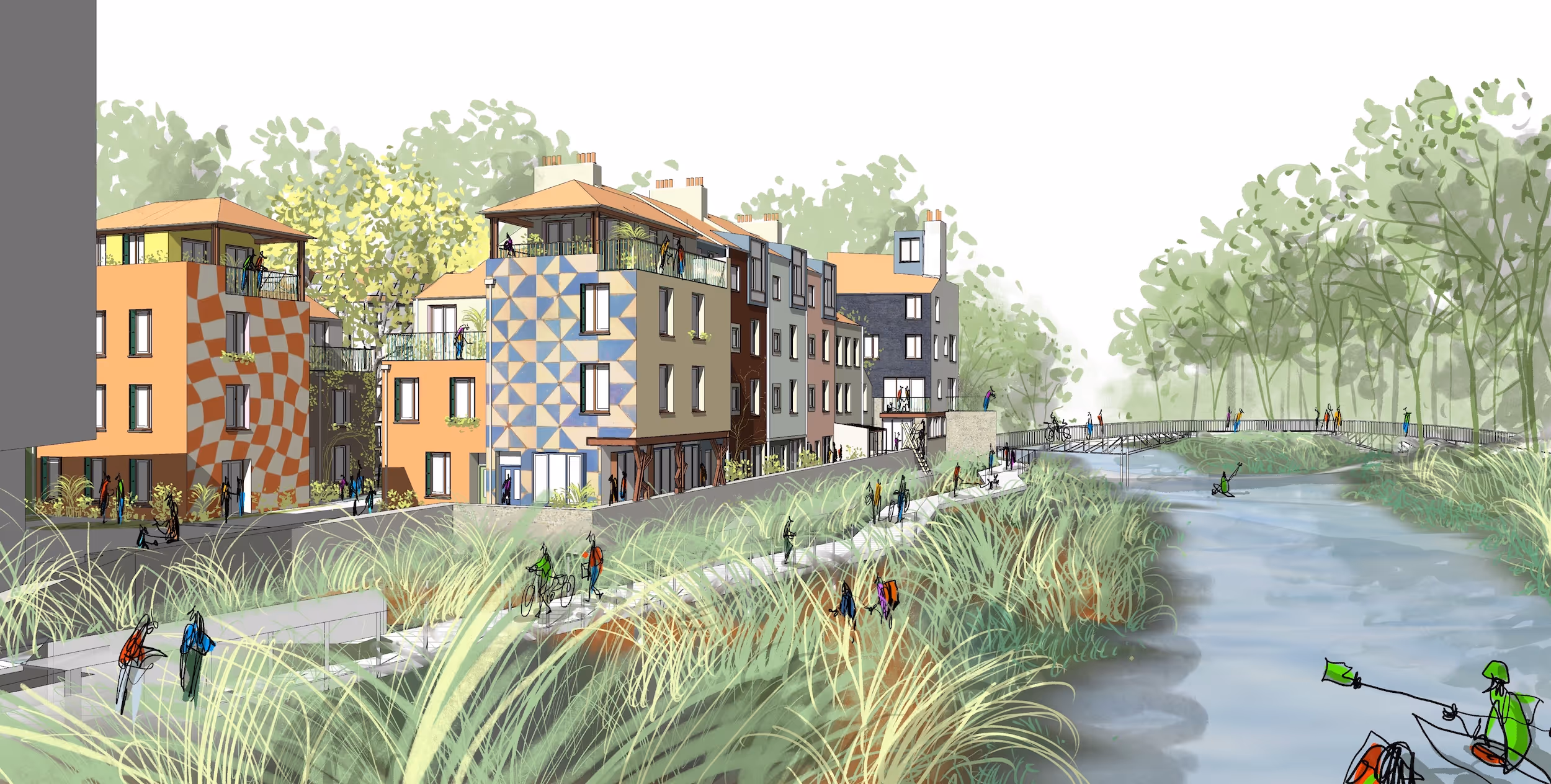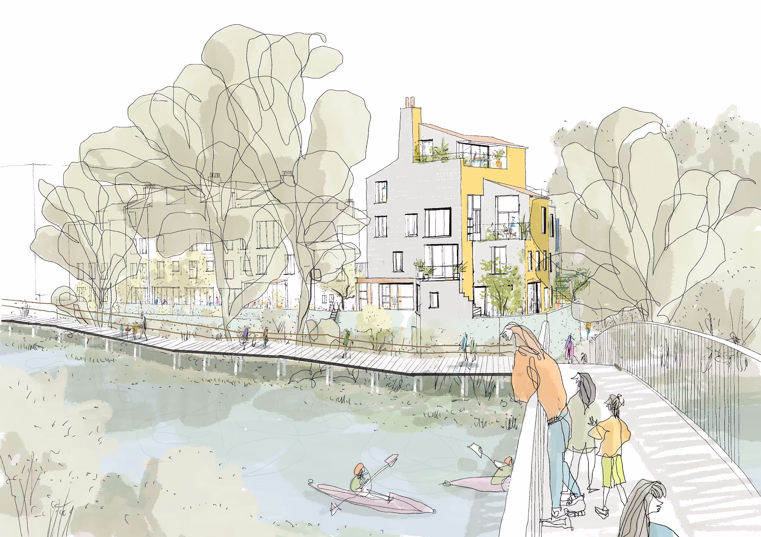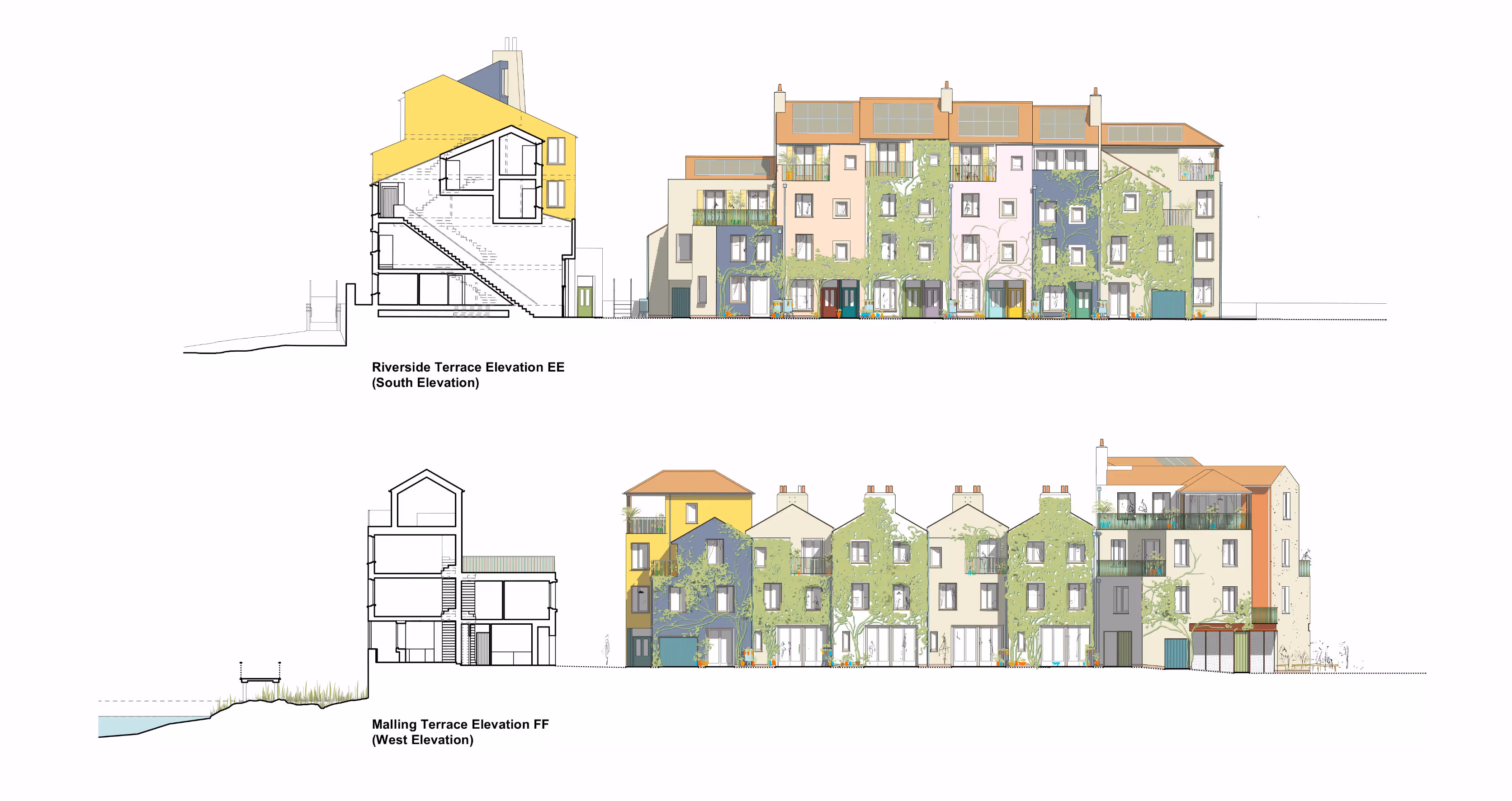 The Phoenix is a productive, sustainable, equitable and largely car-free neighbourhood of 700 homes on a former industrial site in Lewes, Sussex, a historic market town within the South Downs National Park. Human Nature, local developers, asked Ash Sakula Architects to design the first neighbourhood; one that is respectful of the town character, integrated with the flood wall, and the existing movement patterns of Lewesians. The neighbourhood's house forms, hosting homes of all sizes, jostle against one an other to form a distinctive collage. They are designed for construction in locally grown timber, a lime hemp mix and delicately tinted lime render with huge potential for vertical greening.